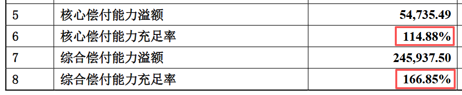 核心偿付能力充足率、综合偿付能力充足率远远超出监管50%、100%的要求,最新风险综合评级B级,破产概率极低。